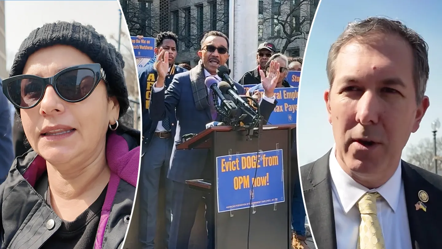 Protesters, some of whom say they were laid off from their federal jobs during DOGE cuts, gathered outside the Office of Personnel Management (OPM) Tuesday ahead of President Donald Trump’s joint address to Congress.