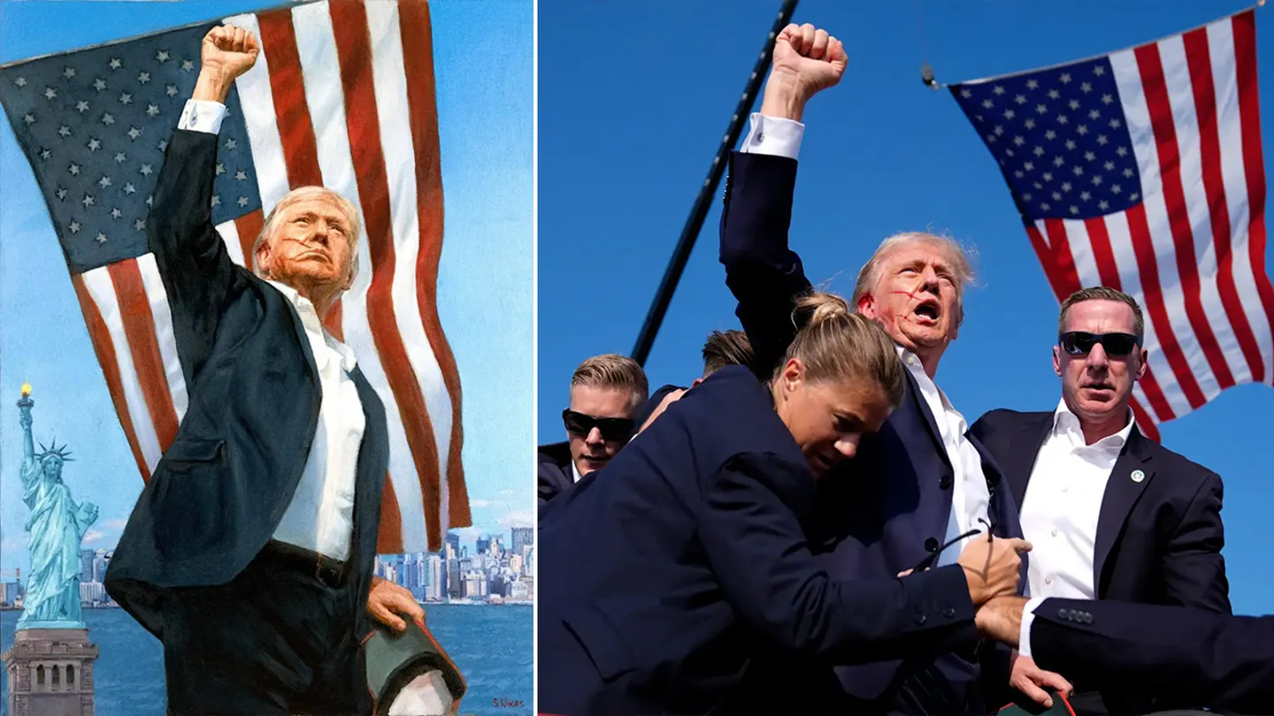 The painting is an illustration of a dramatic photo that captured the moment Trump survived an assassination attempt during a presidential campaign rally in Butler, Pennsylvania, on July 13, 2024.